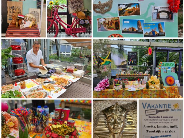 Gisteren zijn de bewoners van De Bieslandhof op 'vakantie' geweest en hebben wel 5 landen in 1 middag bezocht! Zo gingen zij op reis naar Egypte, Amerika, Frankrijk, Jamaica en Italië. Bij ieder land waren er heerlijke hapjes en drankjes. In Italië was er zelfs een mooie pizzeria met heerlijk versgebakken pizza's en tiramisu verzorgd door Luca. De fotohoek werd ook druk bezocht. Hier kon men een mooie ansichtkaart laten maken met 'de groeten uit...' De sfeer was geweldig en de middag was zo'n succes dat zij volgend jaar weer op vakantie gaan naar 5 andere landen.
