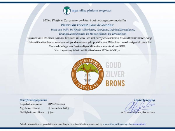 Trots melden wij dat vijf van onze locaties recentelijk het bronzen certificaat van de Milieuthermometer hebben behaald, als erkenning voor hun inzet op het gebied van duurzaamheid. De Hooge Tuinen, De Terwebloem, Duinhof / Strandgoed ter Heijde, Sonnevanck, en Triangel hebben dit jaar het bronzen keurmerk verdiend, terwijl Ontmoetingscentrum Dock van Delft, Veenhage, Akkerleven en De Kreek succesvol hun jaarlijkse keuring hebben doorstaan en hun certificaat behouden.