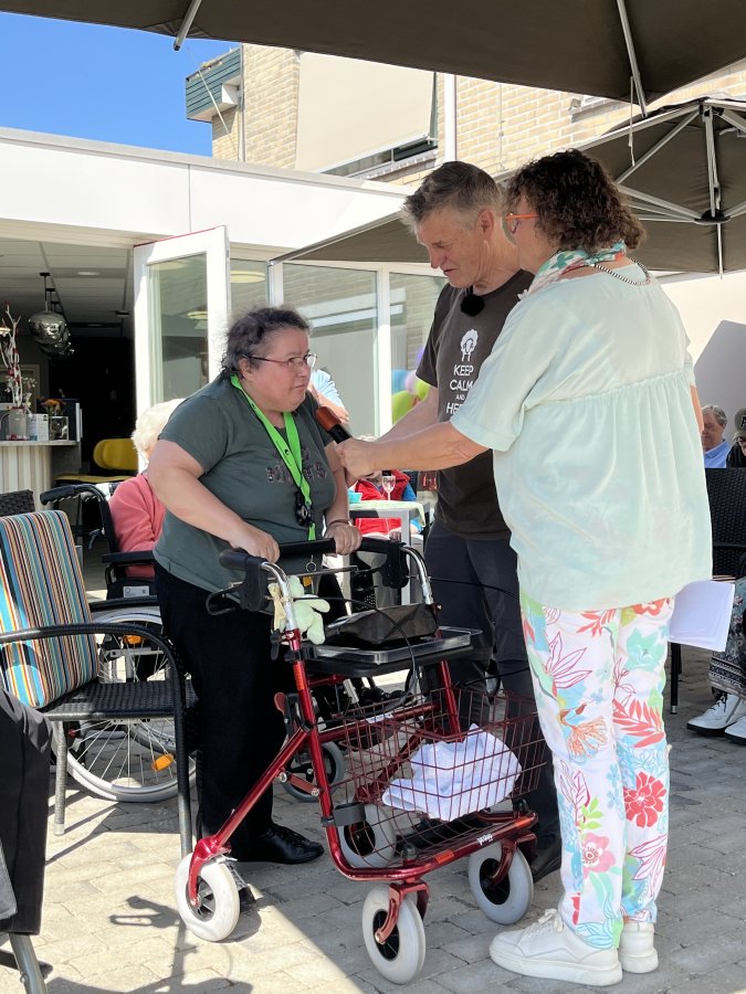 Vrijdagmiddag 4 april was een feestelijke middag bij Duinhof. Vele belangstellenden, waaronder de bewoners, naaste(en) leden van de cliëntenraad, vrijwilligers en collega’s waren uitgenodigd voor de overhandiging van een nieuwe rolstoelfiets namens de Sjaakies.