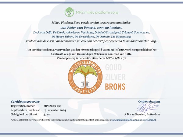 Trots melden wij dat elf van onze locaties recentelijk het bronzen certificaat van de Milieuthermometer hebben behaald, als erkenning voor hun inzet op het gebied van duurzaamheid. De Opmaat en Die Buytenweye hebben het bronzen keurmerk verdiend, terwijl De Hooge Tuinen, De Terwebloem, Duinhof/Strandgoed Ter Heijde, Sonnevanck, Triangel, Ontmoetingscentrum Dock van Delft, Veenhage, Akkerleven en De Kreek succesvol hun jaarlijkse keuring hebben doorstaan en hun certificaat behouden.