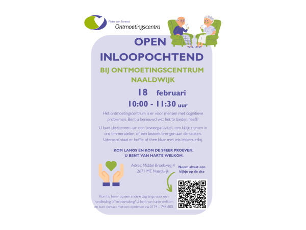 Op dinsdag 18 februari a.s. van 10.00 - 11.30 uur organiseert Ontmoetingscentrum Naaldwijk een gezellige inloopochtend.