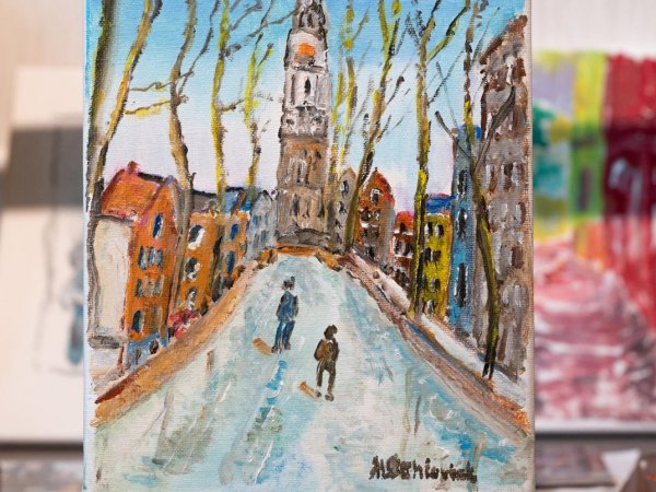 Maria’s woning in de Chopinlaan hangt vol met vele tientallen stadsgezichten in olieverf (zie de voorbeelden hieronder). Er zijn niet alleen werken van Delft, Amsterdam en Rotterdam te zien. Maar van steden over heel de wereld. Maria maakte veel reizen. Binnen Europa, maar ze bezocht ook Australië, Rusland, Indonesië en Japan. En die reizen inspireerden haar weer tot nieuw werk.