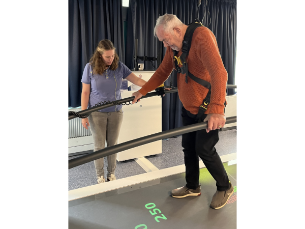 Marije: ‘De C-Mill biedt veel en extra mogelijkheden. Het is niet alleen gericht op lopen, maar ook op uithoudingsvermogen en balans. Dit gaat op een veilige manier. Je zit vast aan een riem, zodat het vallen wordt voorkomen, en er zitten overal stopknoppen. Daarnaast kunnen de relingen aan weerzijden ook op hoogte worden ingesteld waardoor we ook aan een betere en juiste houding kunnen werken. Het is echt een multifunctioneel apparaat. Door de projecties op de loopband worden verschillende taken gecombineerd, zoals obstakels ontwijken of voorwerpen verzamelen, wat zorgt voor een betere training.’