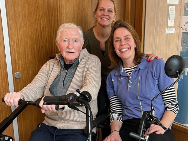 De heer Kirsten schuift inmiddels aan. Op de vraag hoe hij het in het ontmoetingscentrum vindt, antwoordt hij meteen: ‘ Ik vind de regelmaat fijn! Ik heb het erg naar mijn zin en ze zijn hier heel begripvol. Ik kom hier met veel plezier en vindt het hier fijn. Iedereen is gelijkwaardig. Het fietsen op de duofiets vind ik heerlijk. Ik heb tien jaar geleden mijn fiets weggedaan, omdat het verkeer zo druk is geworden en ik het zelf niet meer verantwoord vond. Ik deed thuis niks en dat wil ik niet.’ ‘De heer Kirsten beweegt hier ook ontzettend veel,’ zegt Martine. ‘Hij vindt het heerlijk om op de duofiets te gaan. De eerste keer dat hij samen met een vrijwilliger op pad ging en terugkwam was zijn eerste reactie “dit gevoel heb ik al jaren niet meer gehad.”’ Willemijn: ‘Die activatie/beweging is zo belangrijk. Dat geeft invulling aan een voor hem zinvolle en waardevolle dag. Als ergotherapeuten kijken we wat iemand drijft om nog te doen, wat is betekenisvol? En dan zie je dat het thuis wat lastiger is/wordt. Zo fijn dat iemand dan naar het ontmoetingscentrum kan gaan. Voor mij als ergotherapeut is het ook prettig om te zien dat het ontmoetingscentrum voor iemand een meerwaarde heeft. ’