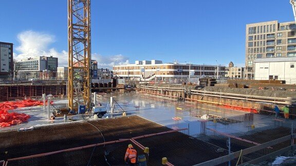 Op de bouwplaats van de Spoorzone wordt volop gewerkt, ongeacht het weer.