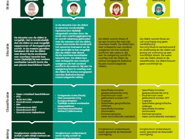 Het toekennen van een beschikbaar gekomen plaats is volledig afhankelijk van de wachtstatus op basis van urgentie, zorgvraag/indicatie en de classificatie (situatie cliënt en urgentie). Dit zijn landelijke richtlijnen. Zie onderstaande infographic en/of lees meer informatie op de website van de zorgkantoren: www.zn.nl/zorgkantoren.