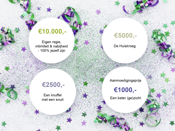 In principe zijn er drie prijscategorieën, namelijk €2500,-, €5000,- en €10.000,-. Hieronder leest u wat de winnende ideeën zijn.