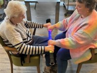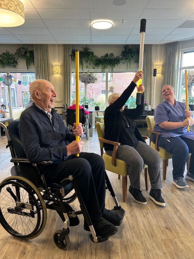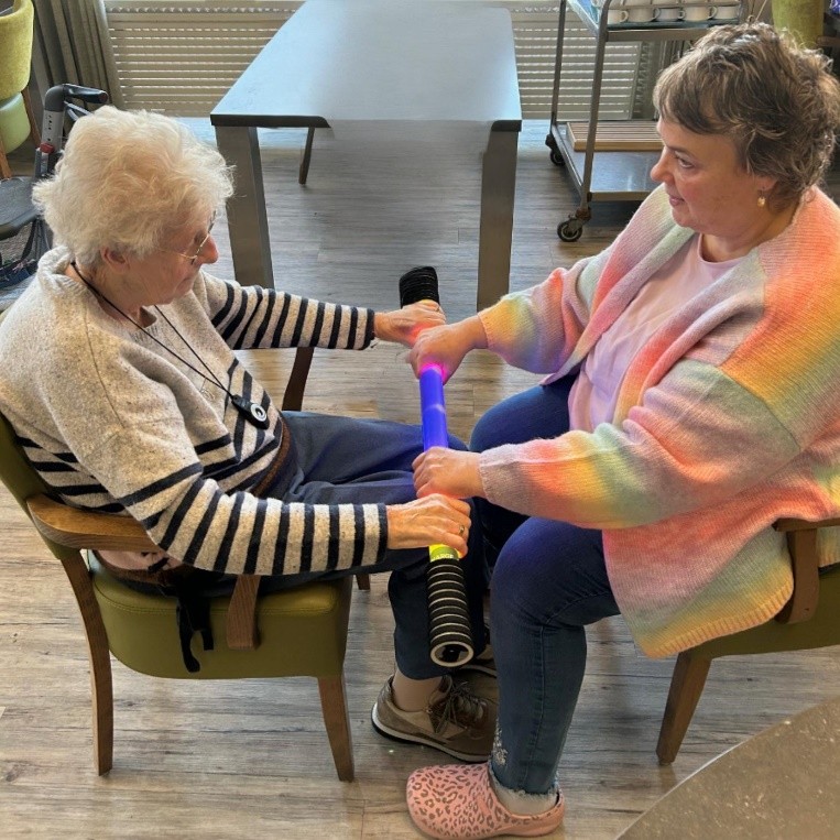 Zowel in de huiskamer als in de beweeggroep wordt de Moofiestick nu volop ingezet. De Moofiestick geeft leuke en uitdagende beweegopdrachten die individueel, in tweetallen of in groepsverband kunnen worden uitgevoerd. De stick spreekt de opdrachten op een begrijpelijke manier stap voor stap uit. Het reageert op aanraking en beweging en stimuleert door middel van gekleurde lampjes, geluid en muziek om te blijven bewegen. Zo doet de bewoner met de Moofiestick de bewegingen voor de deelnemers van de beweeggroep voor. De overige bewoners doen de oefeningen dan met gewone stokken na. De opdrachten sluiten goed aan bij de bewoners waardoor ze extra gestimuleerd zijn. Ook voor de bewoners waarvoor het lastig is om mee te doen of met cognitieve achteruitgang heeft de stick extra meerwaarde en is iedereen er erg enthousiast over. Mooi om te zien hoe in de huiskamers de stick spontaan wordt gepakt om met elkaar in beweging te komen.
